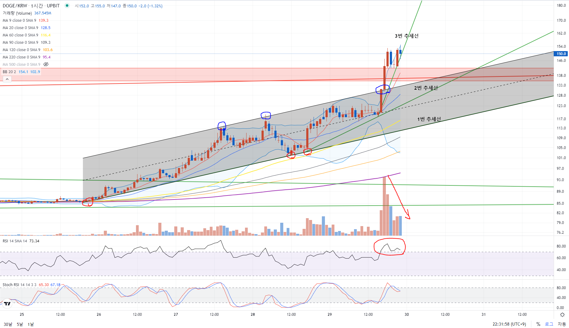 .- 위 차트는 참고용으로 첨부한 도지코인 5분 봉 차트입니다.