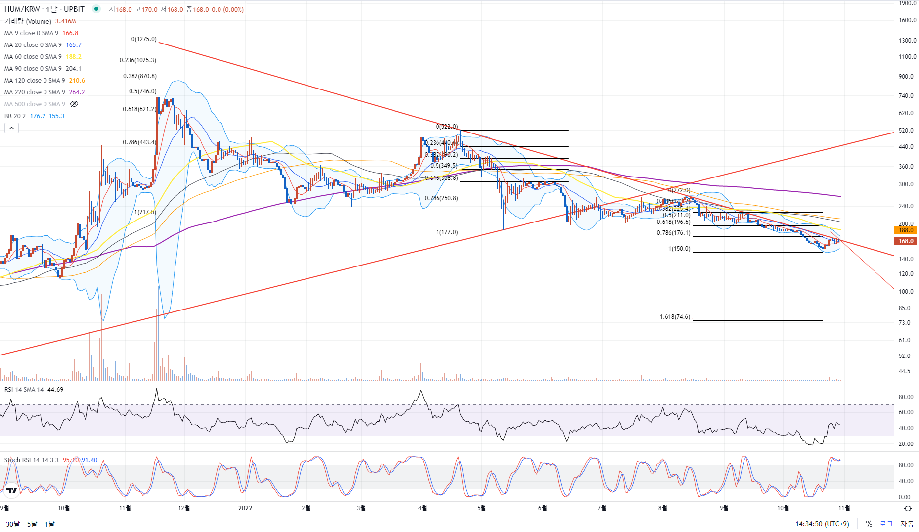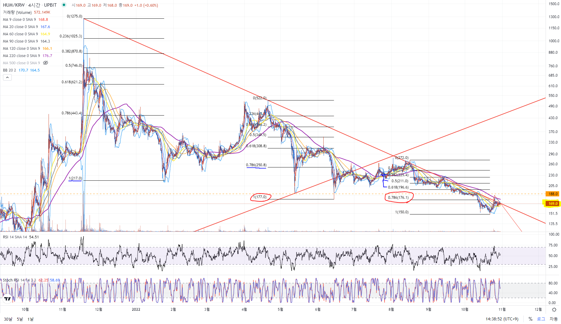 .- 위 차트를 통해 21.11.18부터 이어진 하락 추세선의 상단에 맞닿아 있는 것을 알 수 있습니다.