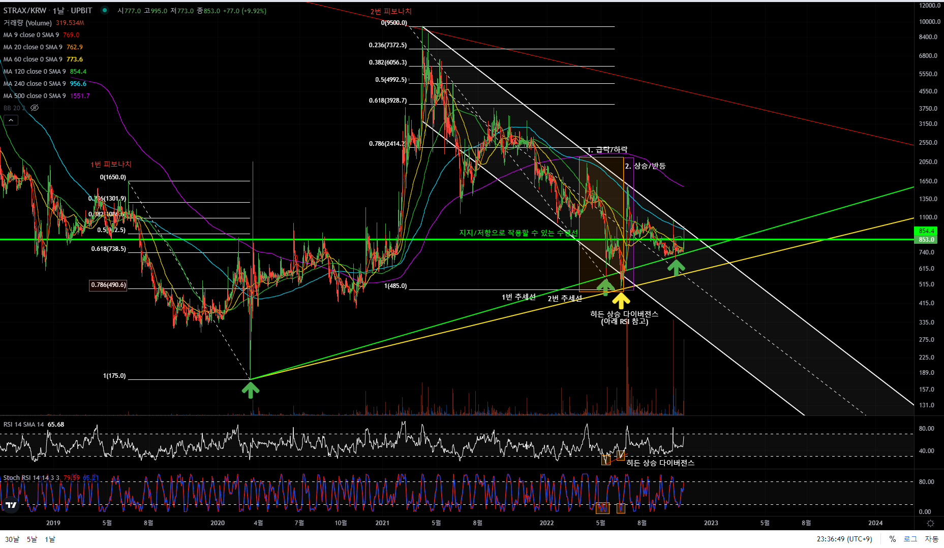 .- 해당 차트를 보고 히든 상승 다이버전스의 존재 + 1번 피보나치 0.786(490.6) 값에서의 반등을 알 수 있습니다.