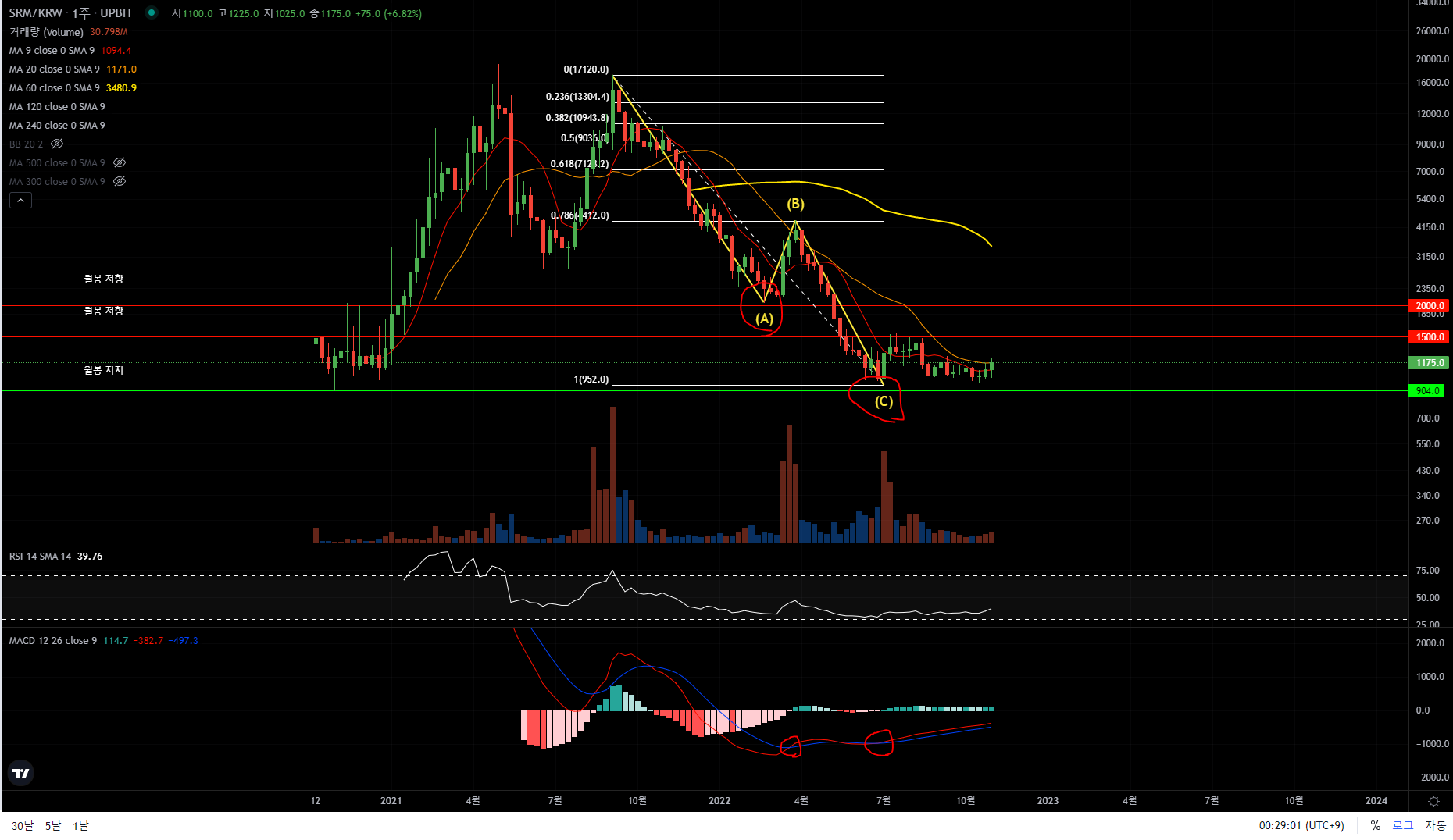 .- 주봉 차트로 A-B-C 패턴 완성에 따른 피보나치 작도